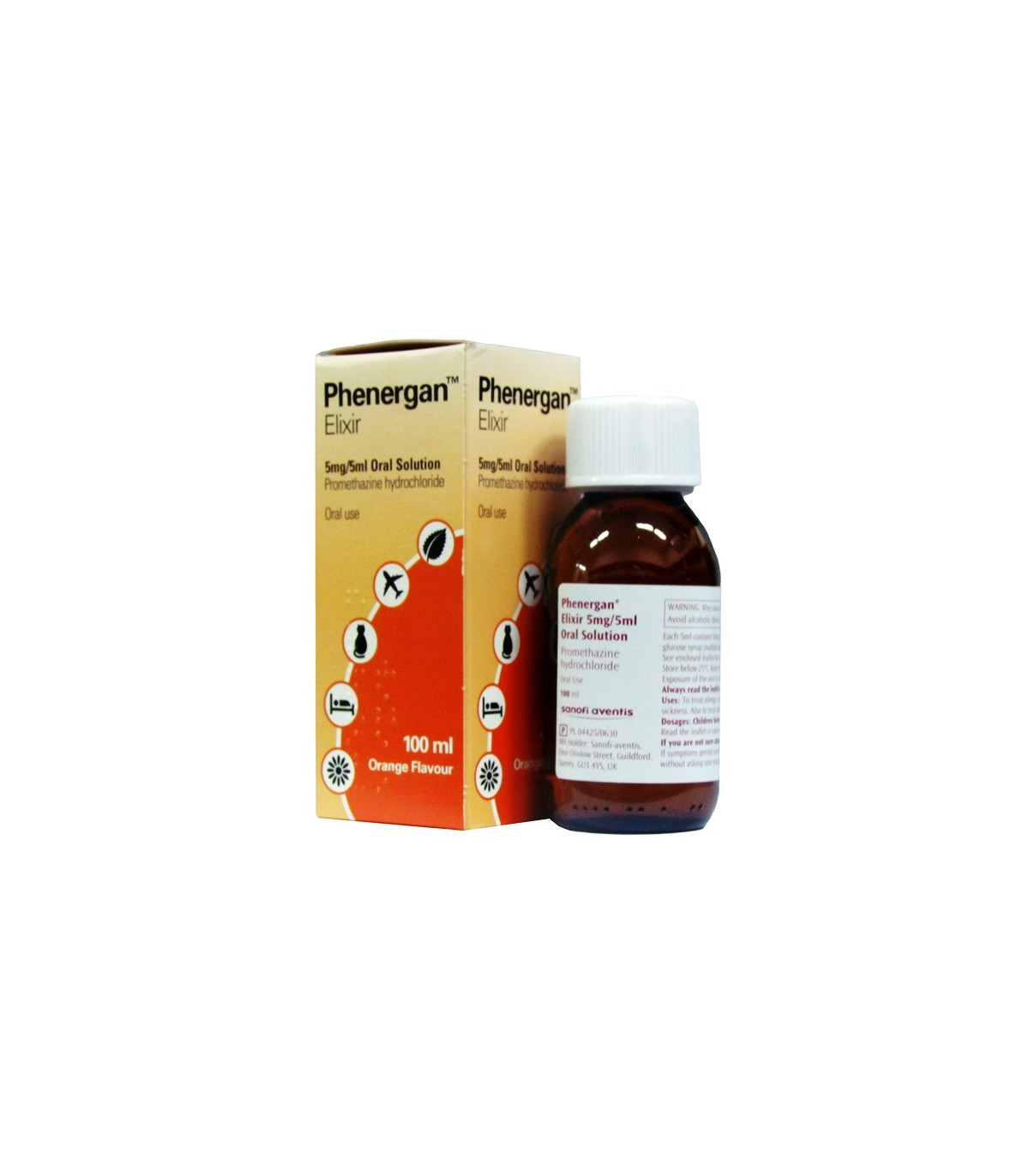 Phenergan Elixir is a trusted antihistamine syrup designed to relieve allergy symptoms, motion sickness, and nausea. It helps reduce sneezing, itching, watery eyes, and runny nose while also calming symptoms of travel sickness and irritation caused by colds or allergies.